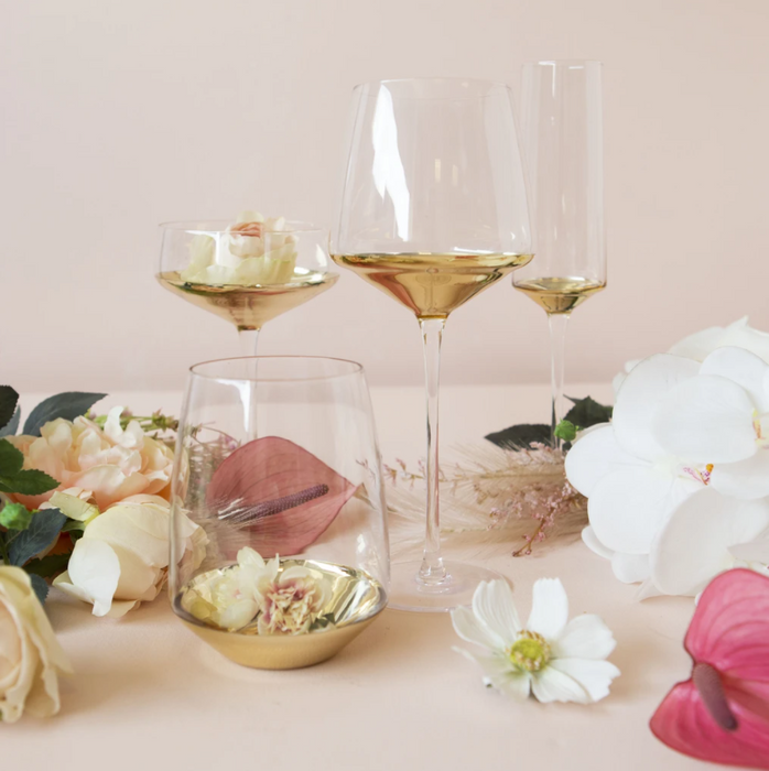 The Estelle Crystal Glassware Collection is a true expression of artistry, originality and luxury. Featuring an ultra contemporary design with elegant sinuous curves made with fine hand blown crystal and gold lustrous finishes. Available in a variety of vessels to enjoy wine, champagne and cocktail beverages as well as decadent desserts in style.
