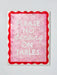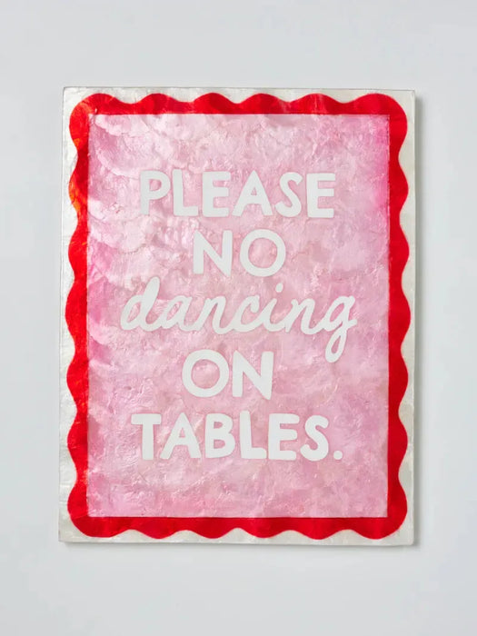 Bring playful fun energy to your space with the Fun House Dancing Tile. This oversized, handcrafted capiz shell tile boasts a vibrant pink hue and cheeky red squiggle border framing the playful phrase "Please No Dancing On Tables". Perfect for entertaining areas, this one-of-a-kind artisan piece injects personality with its light-hearted reminder to embrace fun (responsibly ha ha). Crafted with artistry, it blends capiz shell allure with hand-painted charm. Ready to hang with a hook on the back.